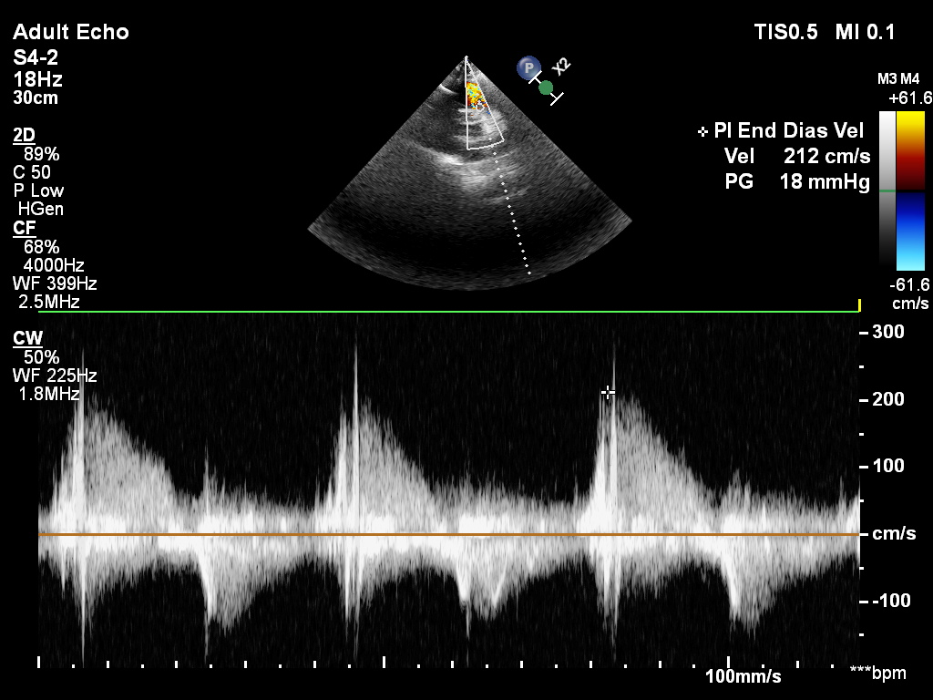 CW Doppler przez zastawkę pnia płucnego – szybki spadek pędkości fali zwrotnej wskazuje na ciężką niedomykalność płucną